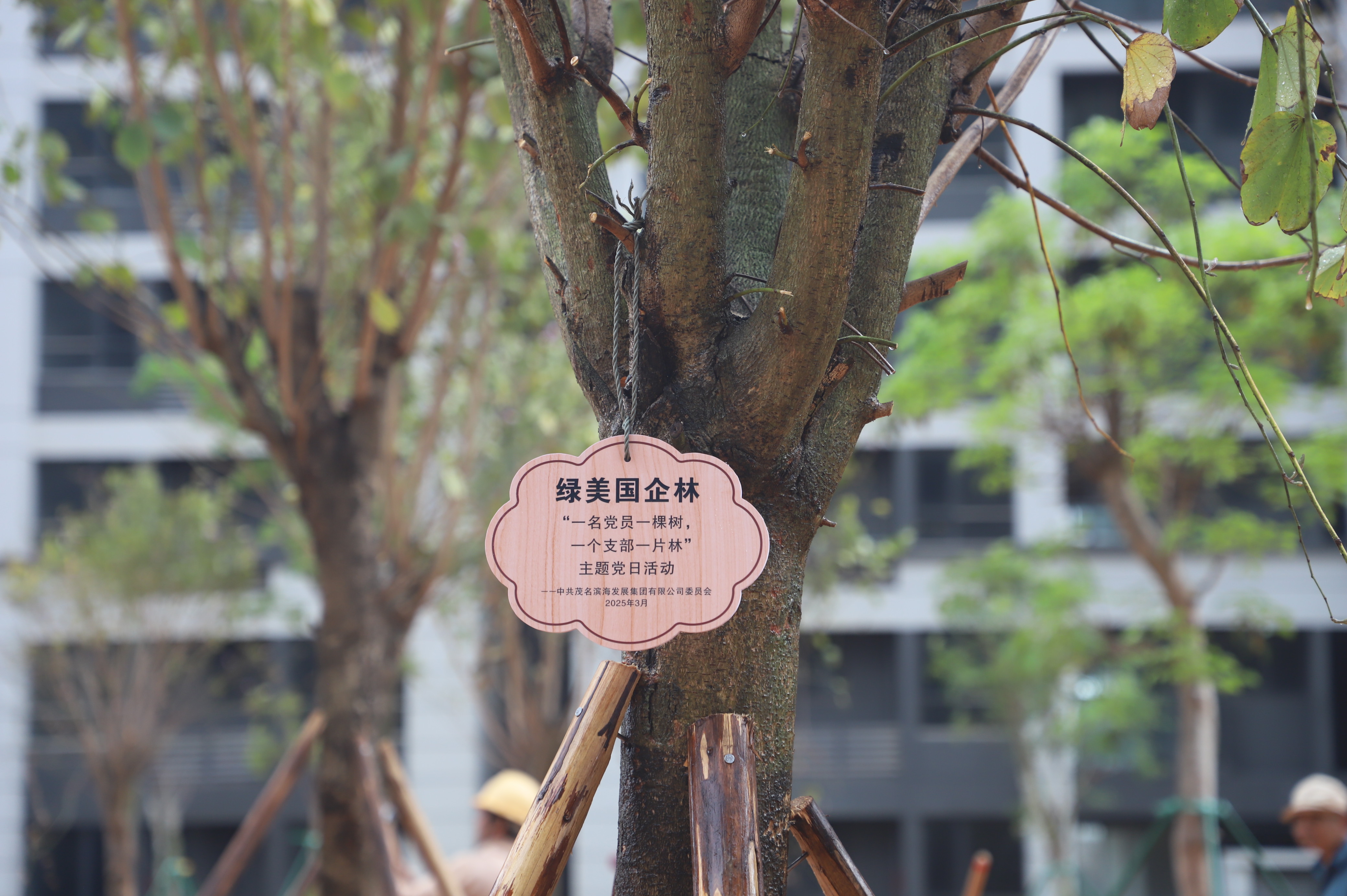 “植樹既是履行國企社會責任,更是擦亮生態發展底色的具體實踐。”集團領導在活動中強調,茂名濱海發展集團始終將生態優先理念貫穿于城市建設與運營中,此次選擇東灣綠城——這座規劃中的濱海生態新城作為植樹點,既是對項目綠色基因的厚植,也彰顯了國企助力“綠美廣東”目標的擔當。活動現場同時對集中成片成林的樹加掛“綠美國企林”牌子,設置黨員責任區,由各支部黨員認養、監督、維護新植樹苗,確?!胺N植一片、成活一片、綠美一片”。